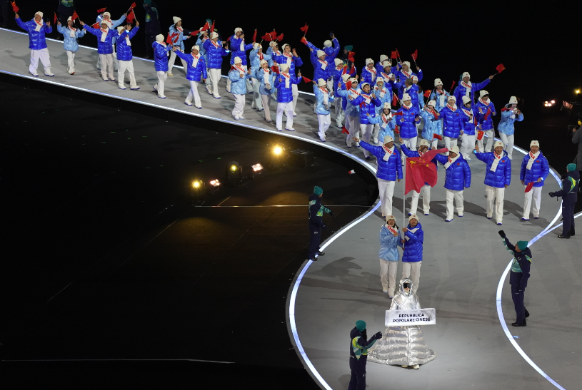 2月6日晚,2026年米兰-科尔蒂纳冬奥会开幕式在意大利米兰圣西罗体育场举行。图为中国代表团入场。(图片来源:中新社)