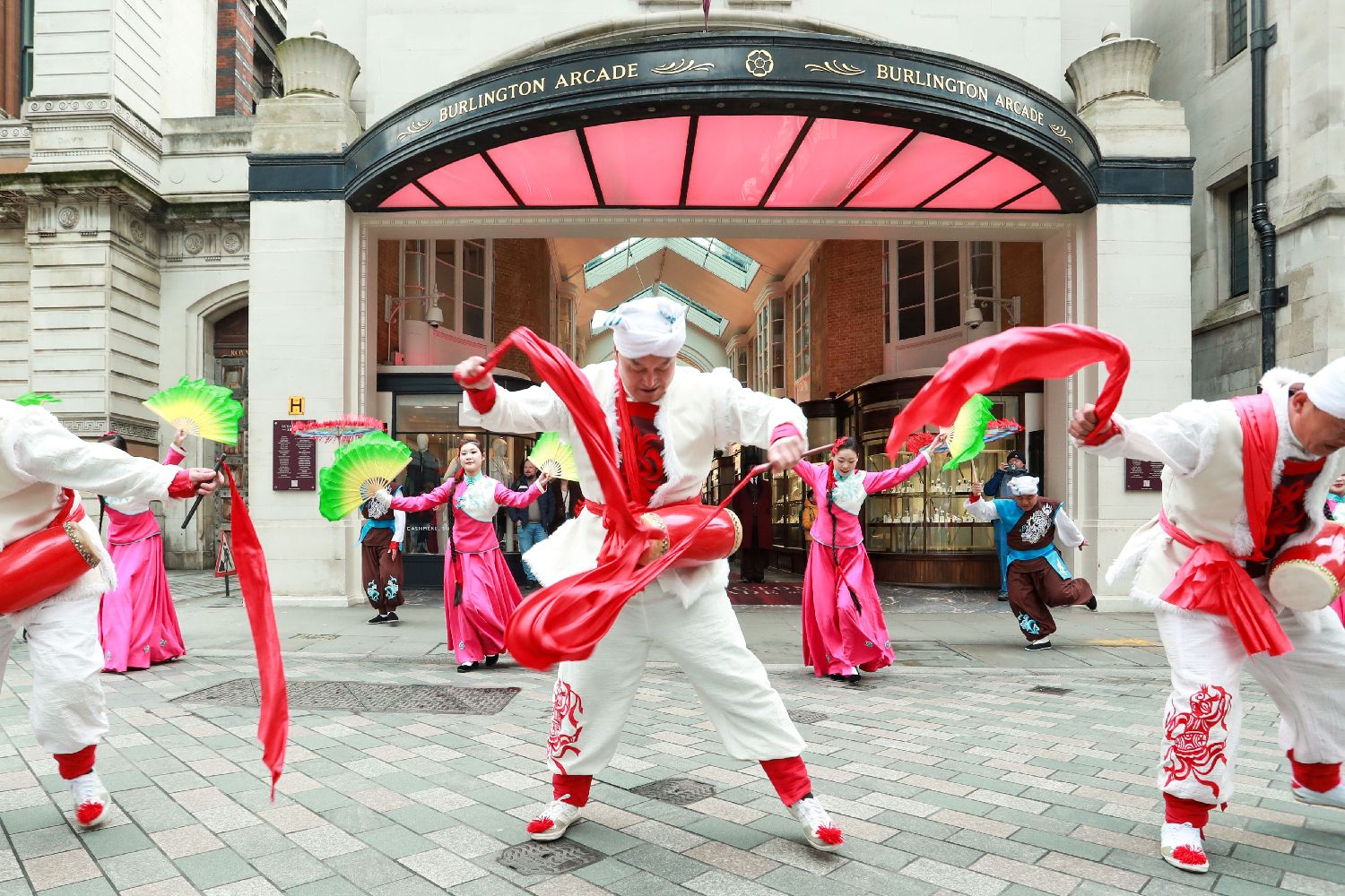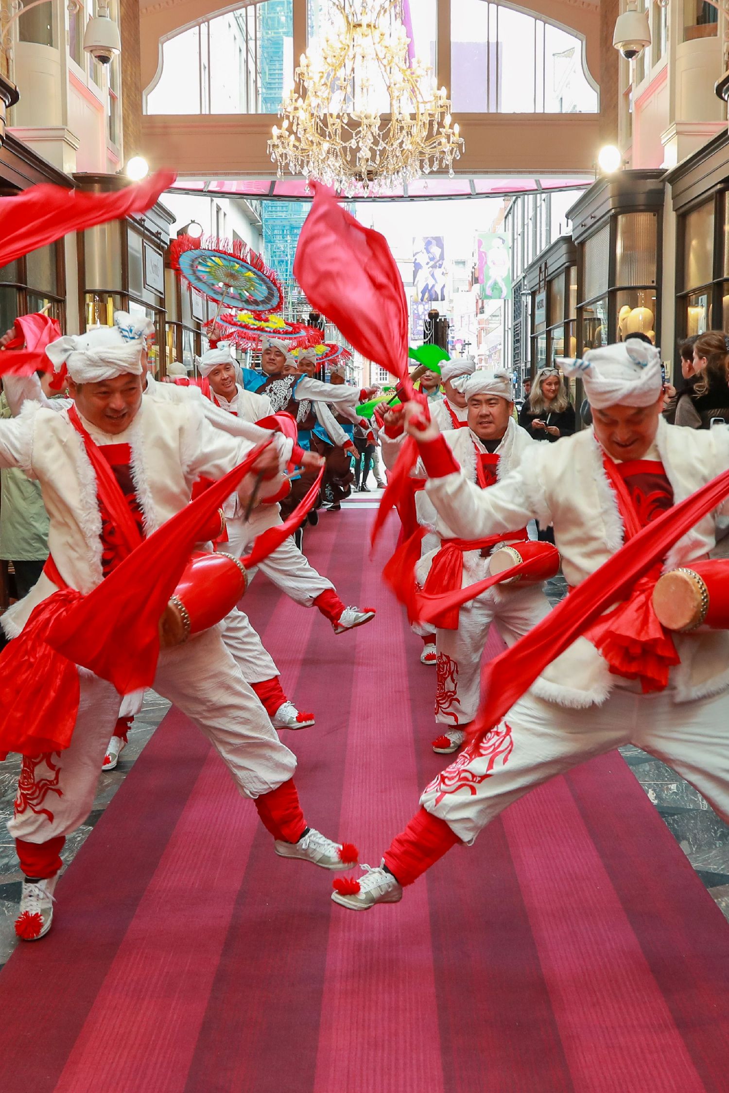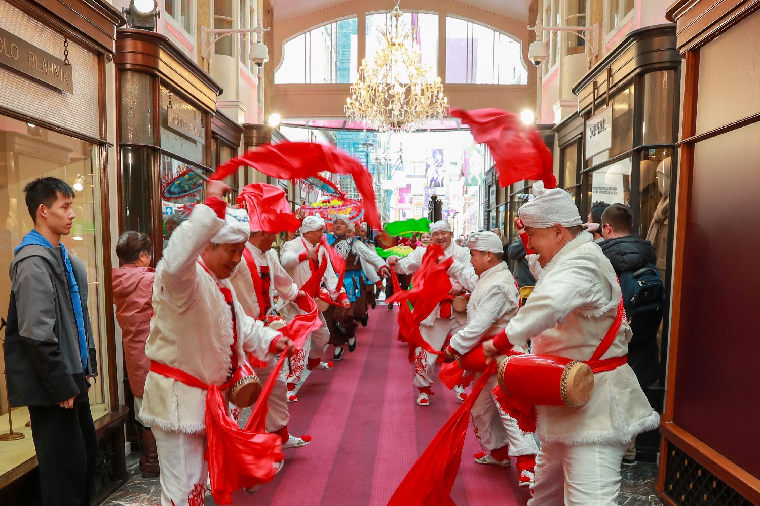 对这座以精致与安静著称的英式拱廊而言,铿锵鼓声与鲜艳服饰带来的视觉与听觉冲击颇为少见。表演从入口一路延展至拱廊内部,鼓点层层推进,舞步轻快有力,吸引不少游客驻足围观与拍摄。
