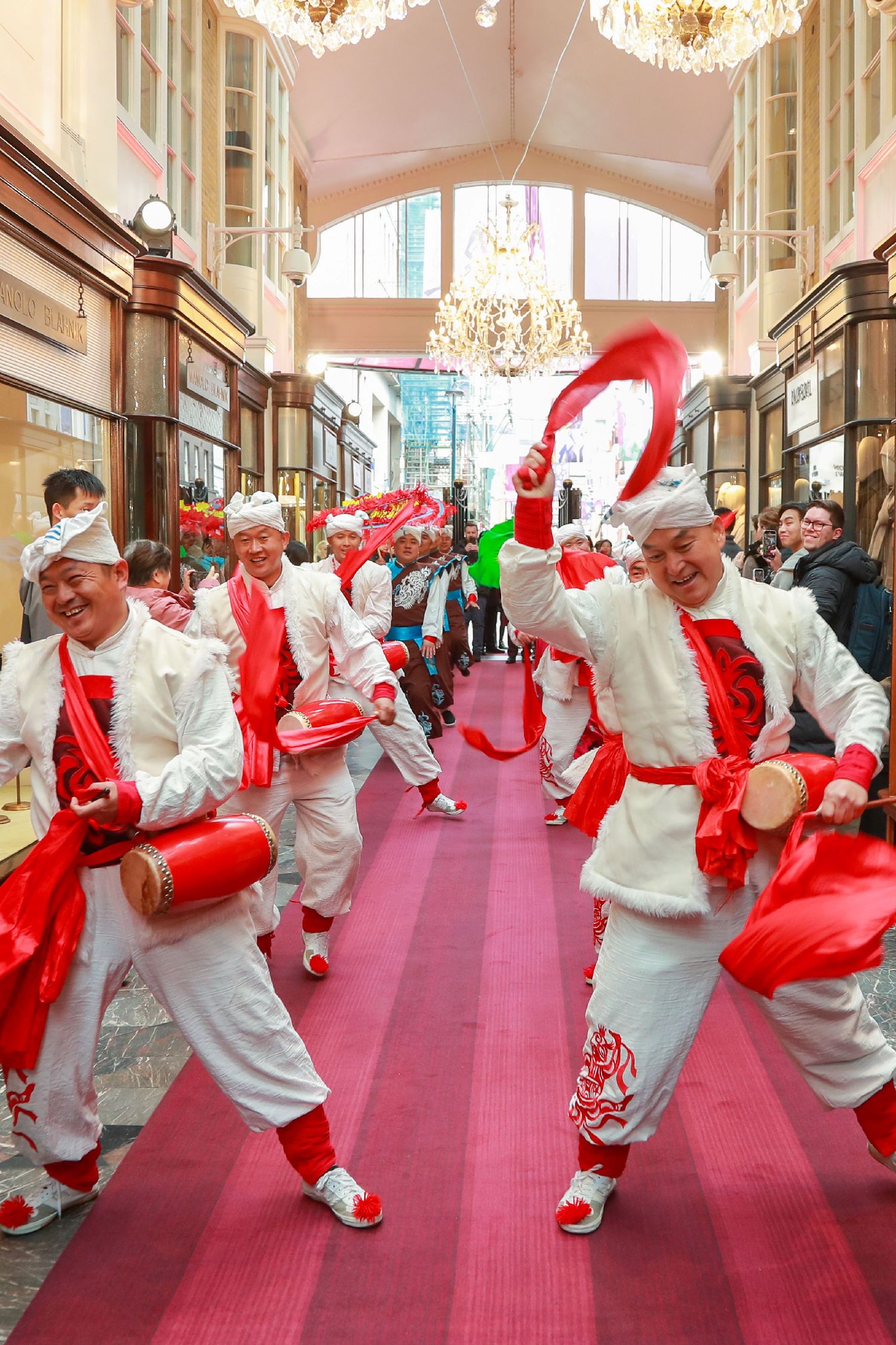【欧洲时报记者田皓雪子、见习记者卢天爱采访报道】鼓点由远及近,在拱廊穹顶下回响。2月21日上午,位于伦敦梅费尔的百年地标伯灵顿拱廊迎来一场富有中国年味的演出。来自中国陕西的安塞腰鼓与延川秧歌团队在此亮相,为农历马年春节增添节日氛围。