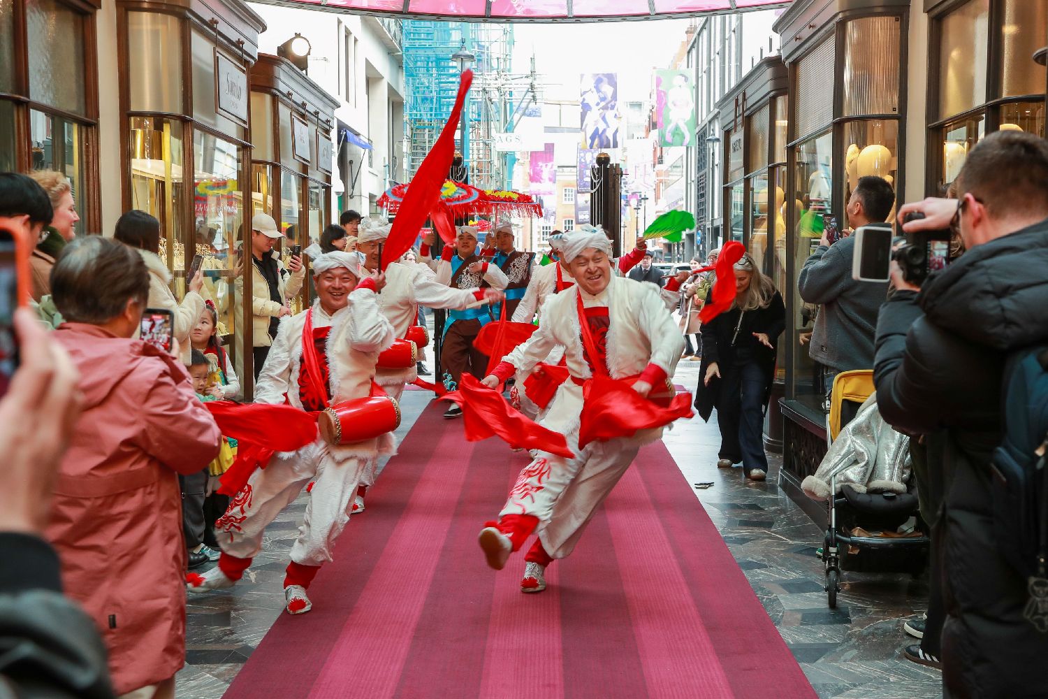 此外,将演出地点设在伯灵顿拱廊,本身也具有一定象征意味。自1819年落成以来,伯灵顿拱廊长期见证伦敦城市生活与文化的变迁,也是连接不同文化、艺术与生活方式的国际交流平台。此次陕西非遗表演走进拱廊,在传统英伦建筑语境中呈现中国春节元素,使两种不同文化在同一场域中自然交汇,也让观众在城市核心地带近距离感受中国年俗的氛围。