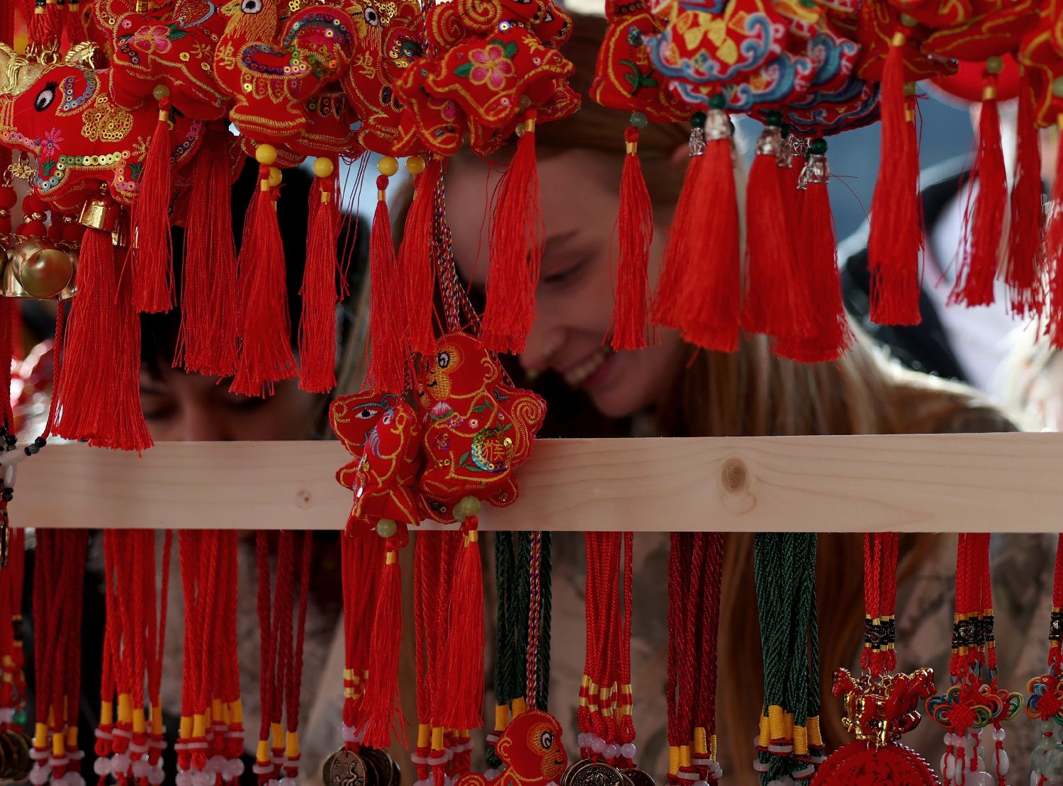 2月22日,一名女子在英国伦敦市中心的特拉法加广场参加春节庆典。
