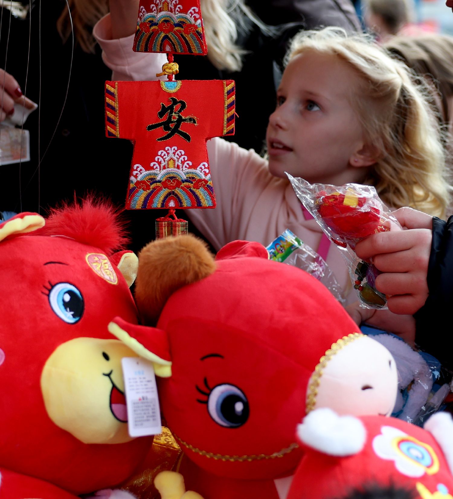 2月22日,一名女孩在英国伦敦市中心的特拉法加广场参加春节庆典。
