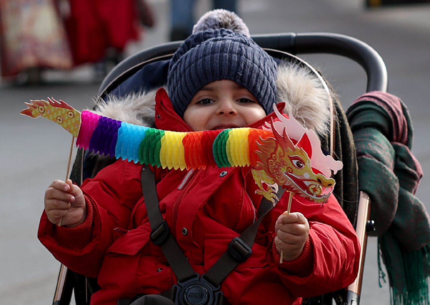 2月22日,一名儿童在英国伦敦市中心的特拉法加广场参加春节庆典。