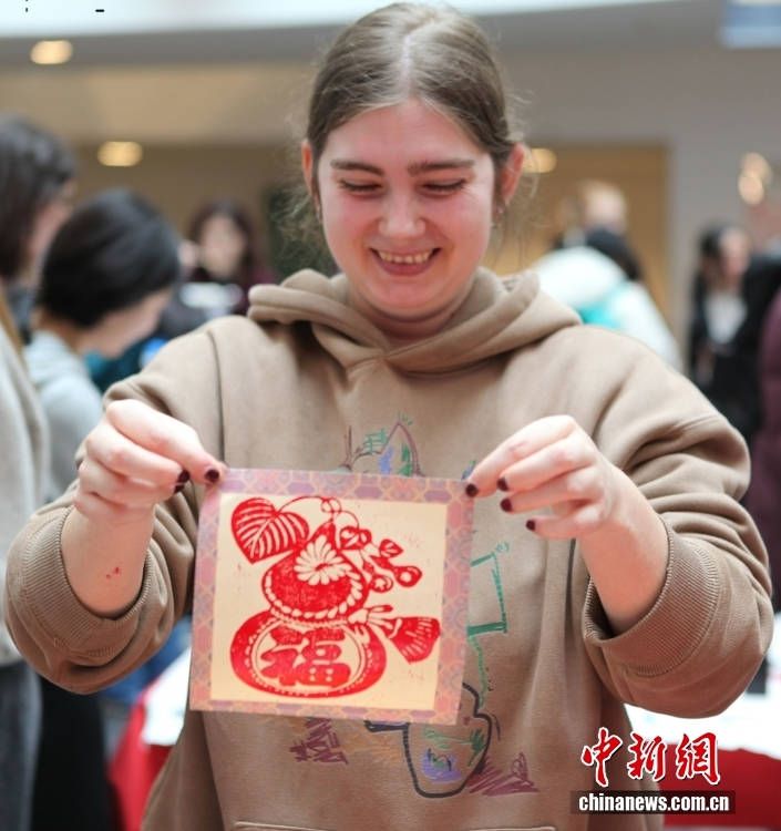 鲁汶大学学子体验中国拓印技艺,展示自己拓印的福字。(图片来源:中新网)