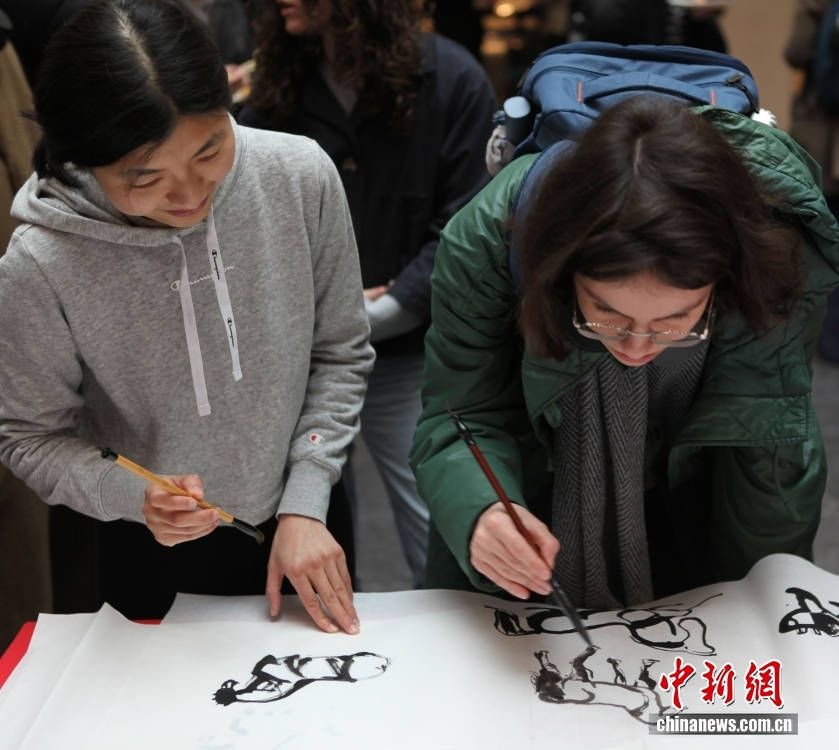 鲁汶大学学子体验中国水墨画,学画“骏马图”。(图片来源:中新网)