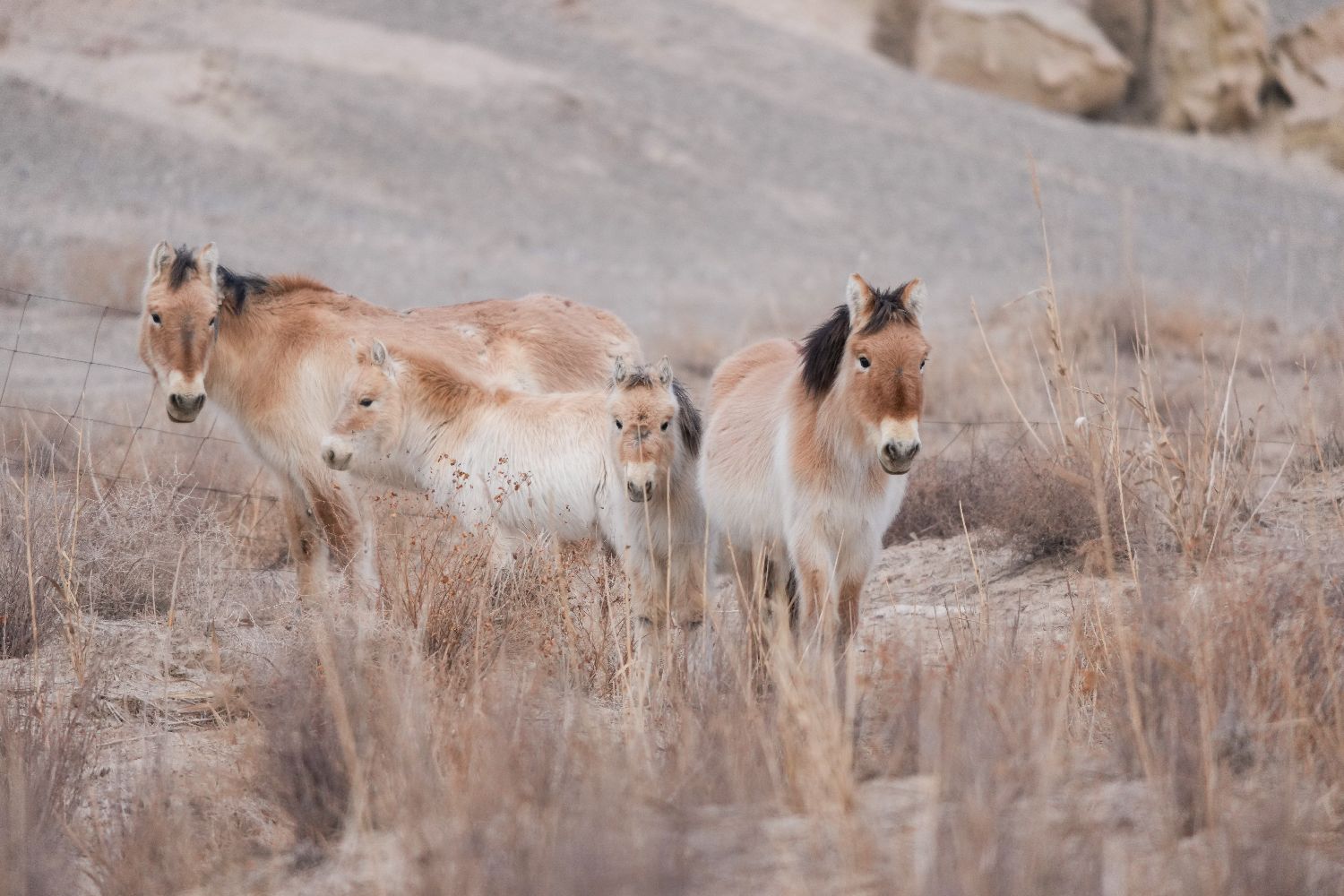 就这样,一匹匹野马重归故土,撑过一个又一个冬天,种群规模一点点壮大。2025年,在中国新疆乌鲁木齐举行的“普氏野马回归40周年”活动上公布的数据显示,中国普氏野马种群数量已突破900匹,占全球总量的三分之一,被国际公认为物种重引入的成功典范。图为2025年9月24日在中国甘肃敦煌西湖国家级自然保护区内拍摄的普氏野马和小马驹。
