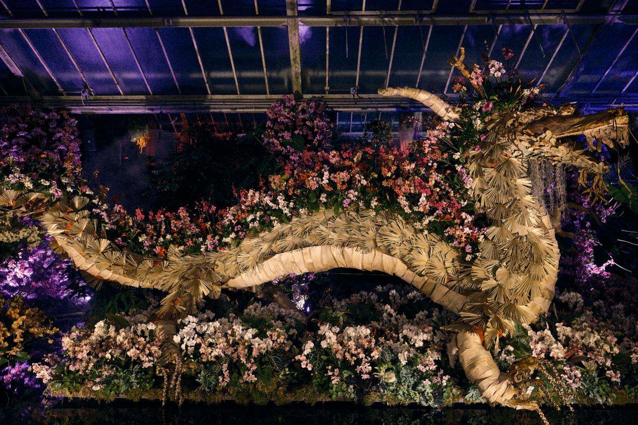 温室内由兰花与植物构成的龙形景观。(图片来源:主办方供图)