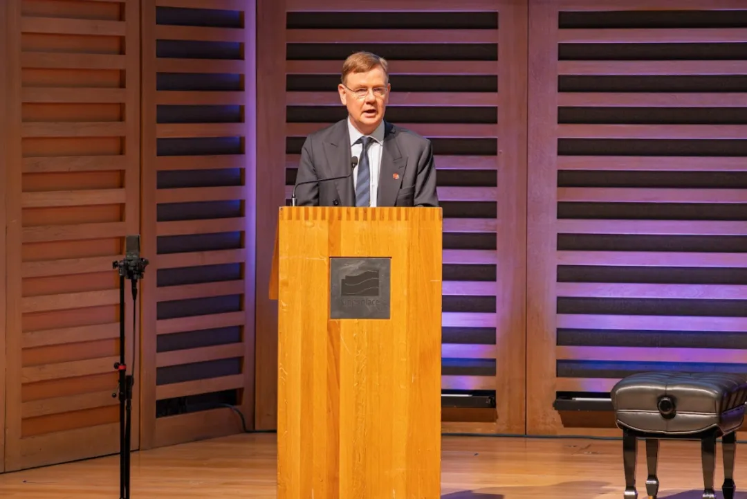 梅纽因学校董事会主席大卫·巴克利先生发表了热情洋溢的讲话,他说,梅纽因学校英国本校与中国青岛校区之间的紧密联动与深度交流,是中英人文合作的生动实践。两校以音乐教育为纽带,在艺术传承、人才培养、文化互鉴等方面携手共进,不仅为两国青少年搭建了成长与交流的桥梁,更以艺术为媒,持续增进中英两国人民的相互理解与友谊,为深化中英文化交流与务实合作注入持久动力。