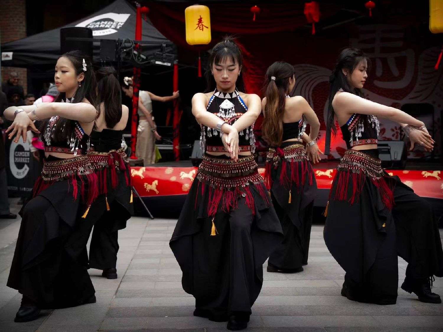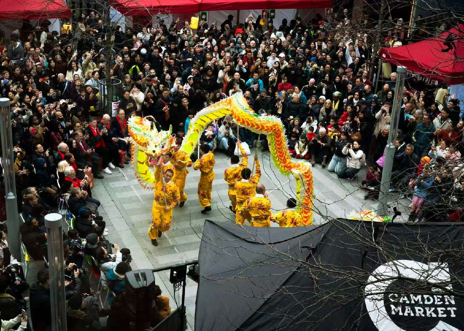 活动当天,卡姆登市场张灯结彩。百年石板街上空,中国非遗鱼灯与红黄灯笼交相辉映,将英伦百年石板街装点成充满东方韵味的“国风灯笼巷”。中国结及生肖马装饰点缀其间,营造出浓浓的年味。
