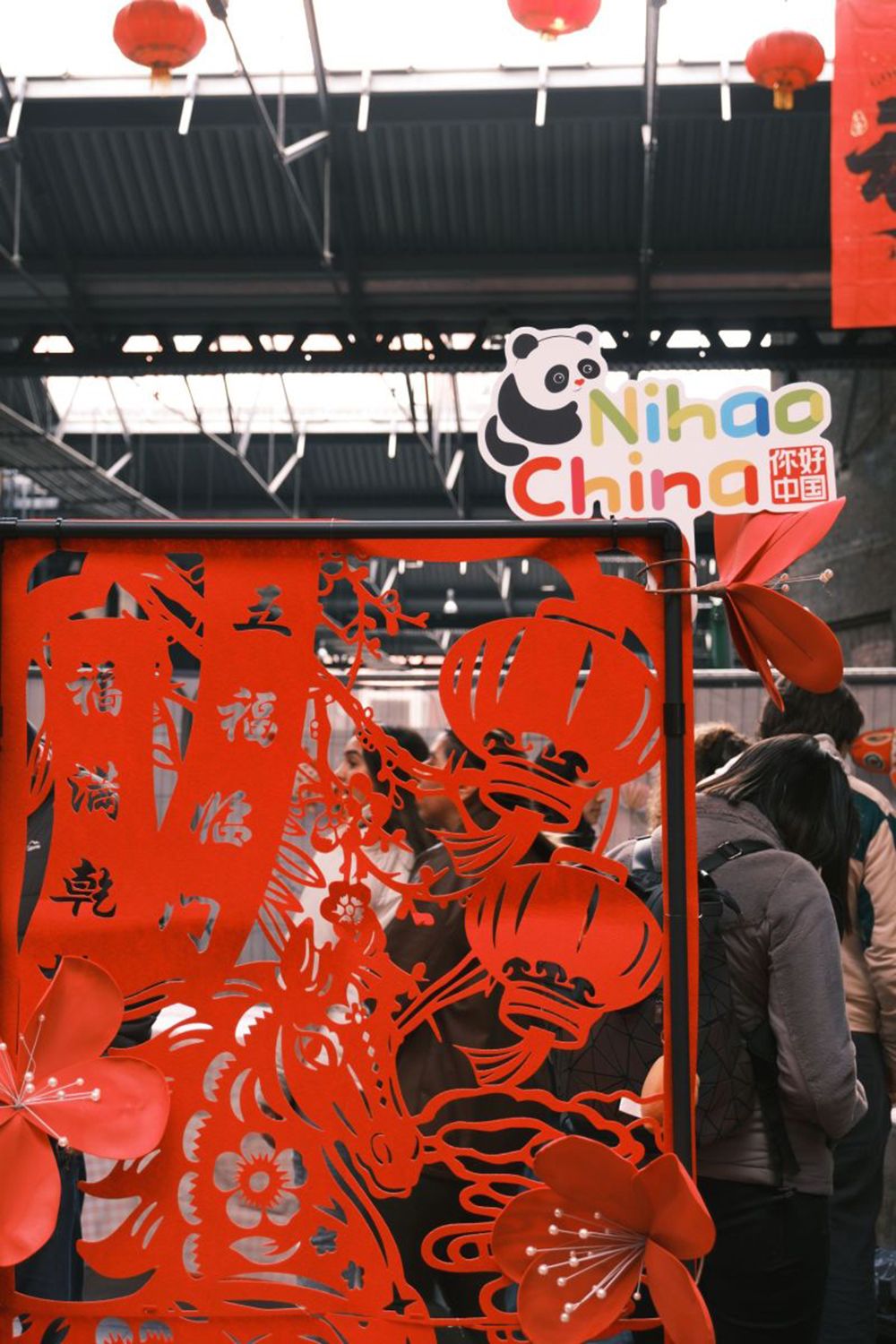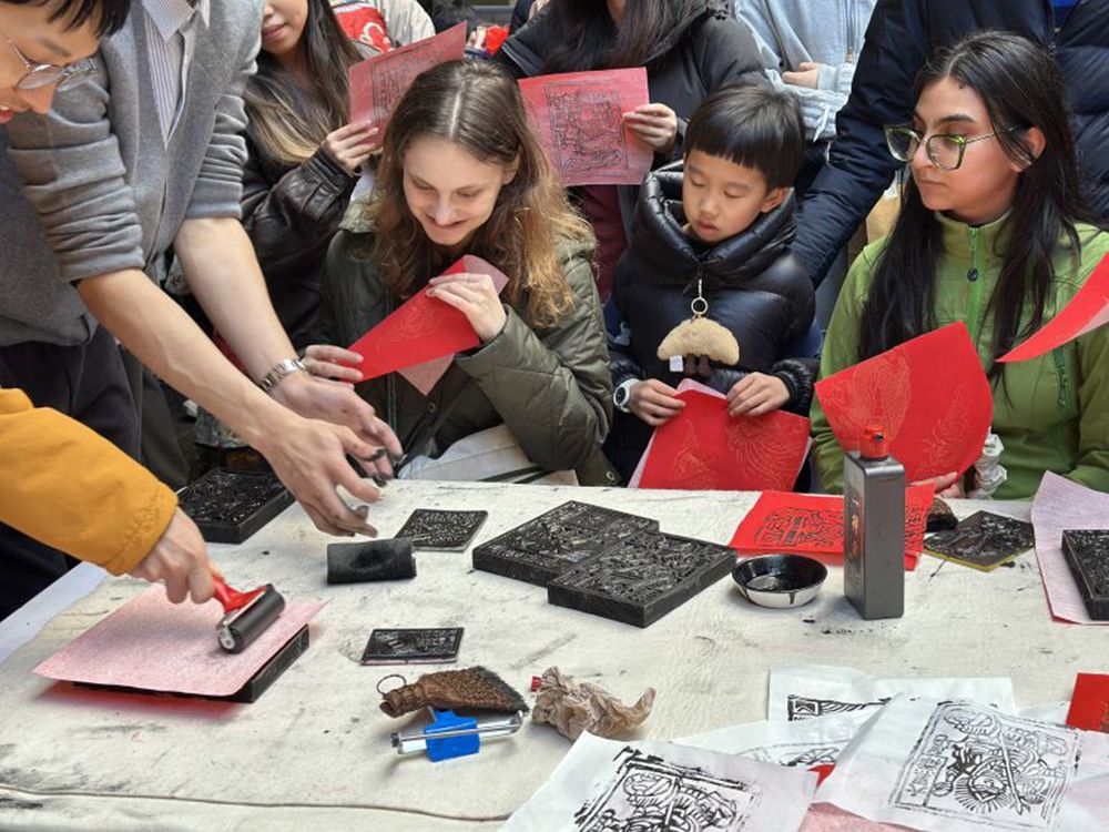 活动现场悬挂200余盏各式中国灯笼及福字、剪纸等作品,民歌演唱、汉服巡游、传统舞蹈及功夫表演轮番上场,书法篆刻、云南木刻、茶道艺术等传统文化体验活动吸引大批游客驻足。