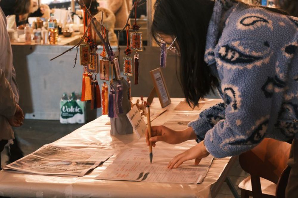 书法篆刻摊主施涵斐说,游客踊跃参加文化体验,不少人拿起毛笔临摹汉字,中国印章更是让他们爱不释手。带有节庆祝福语的挂饰销售火爆,游客纷纷询问祝福语的含义并争相购买。