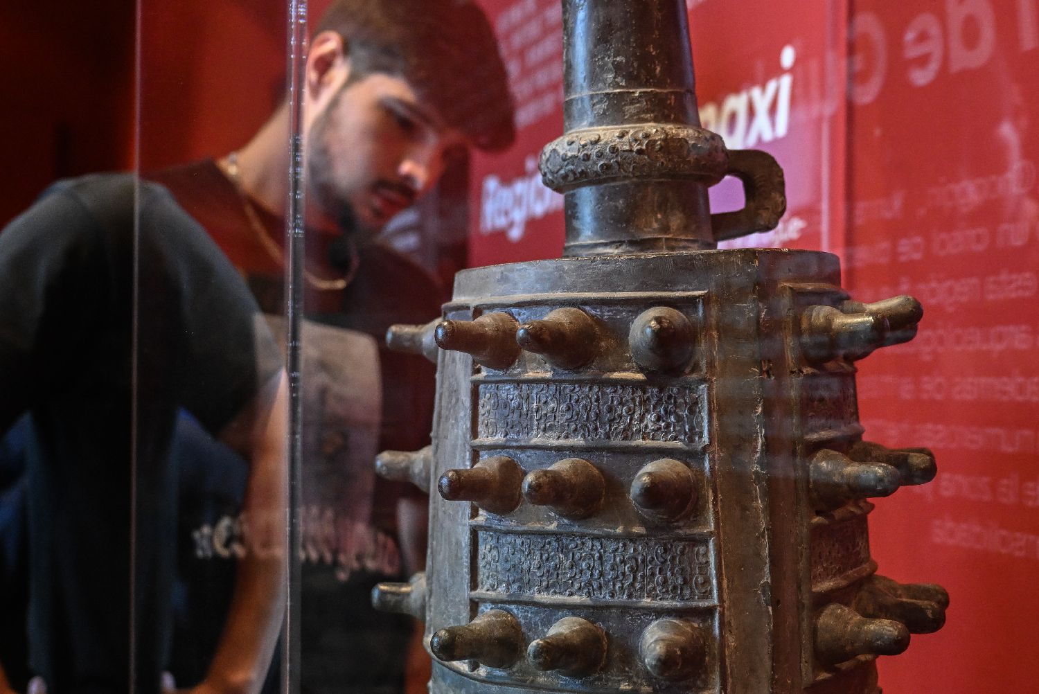 3月17日,在西班牙瓜达拉哈拉博物馆,一名男子参观中国西南地区青铜文明展上来自贵州的展品铜甬钟。
