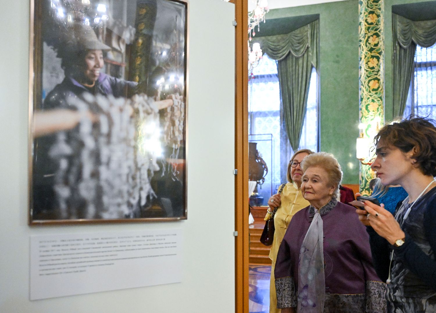 3月20日,在俄罗斯首都莫斯科,俄中友好协会第一副主席加林娜·库利科娃(右二)参观“繁花绽放:中国式现代化的主角”中国妇女事业发展成就图片展。