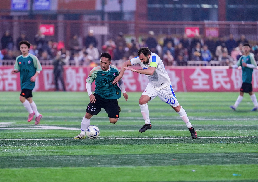 比赛中,双方拼抢激烈、配合默契,榕江县大利侗寨足球队多次发起精彩进攻,意大利球队则以娴熟脚法灵活反击。最终,意大利罗马工程师协会足球队在加时赛最后50秒攻入关键一球,以4:3取胜。