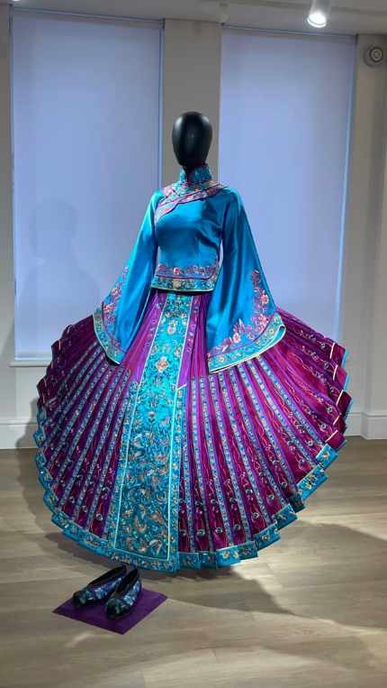 展厅中一件名为《东鹤渐深》的作品格外引人注目。以晚清旗袍为灵感的服装结构被重新解构,通过刺绣与褶裥形成接近雕塑的形态,东西美学交织。传统形制与现代结构在同一件作品中并置,像是两个时代在同一瞬间相遇。