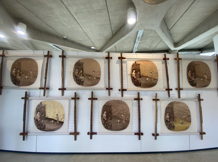 展览呈现7件以南宋李嵩《骷髅幻戏图》为蓝本创作的当代刺绣作品。(图片来源:欧洲时报记者严振羽摄)