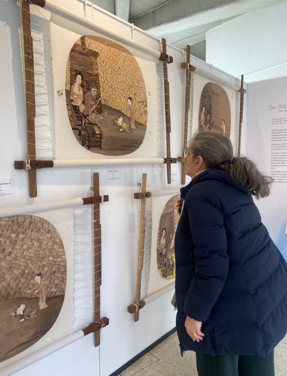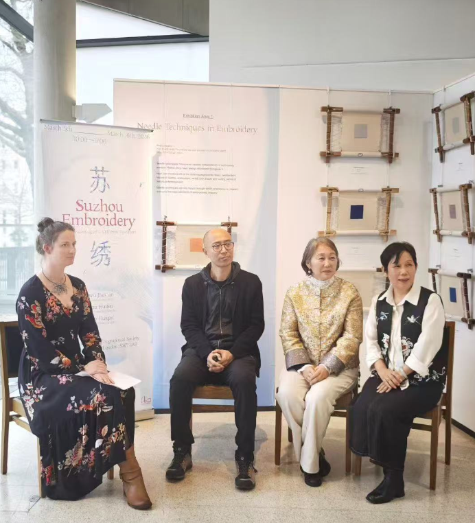 展览期间,姚惠芬、姚惠琴和青年刺绣传承人俞君瑶在3月14日还主持了苏绣体验工作坊,她们结合展览内容,对苏绣发展脉络、工艺体系、独特针法结构进行介绍。英国当地中外参加者随后在艺术家的指导下,体验了苏绣的基础针法和制作过程,进一步理解这一中国传统手工艺在材料、技法和视觉语言的精妙之处。
