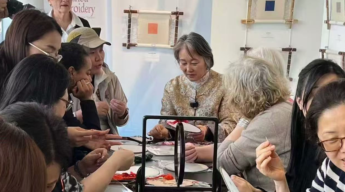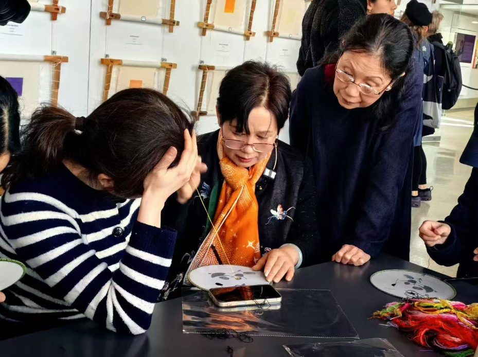 展览期间,姚惠芬、姚惠琴和青年刺绣传承人俞君瑶主持苏绣体验工作坊,吸引众多参观者体验。(图片来源:主办方供图)