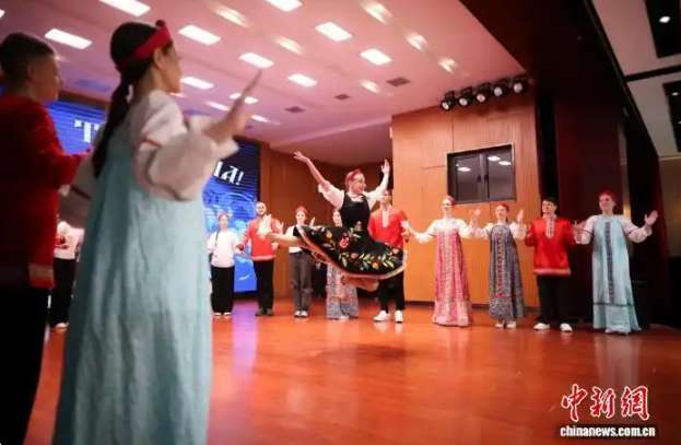 4月2日,2026中俄青少年文化艺术节开幕式在天津外国语大学举行。32名俄罗斯“小鹰”青少年访华团成员与天津外国语大学学子同台展示精彩节目,并举办中俄文化市集。
