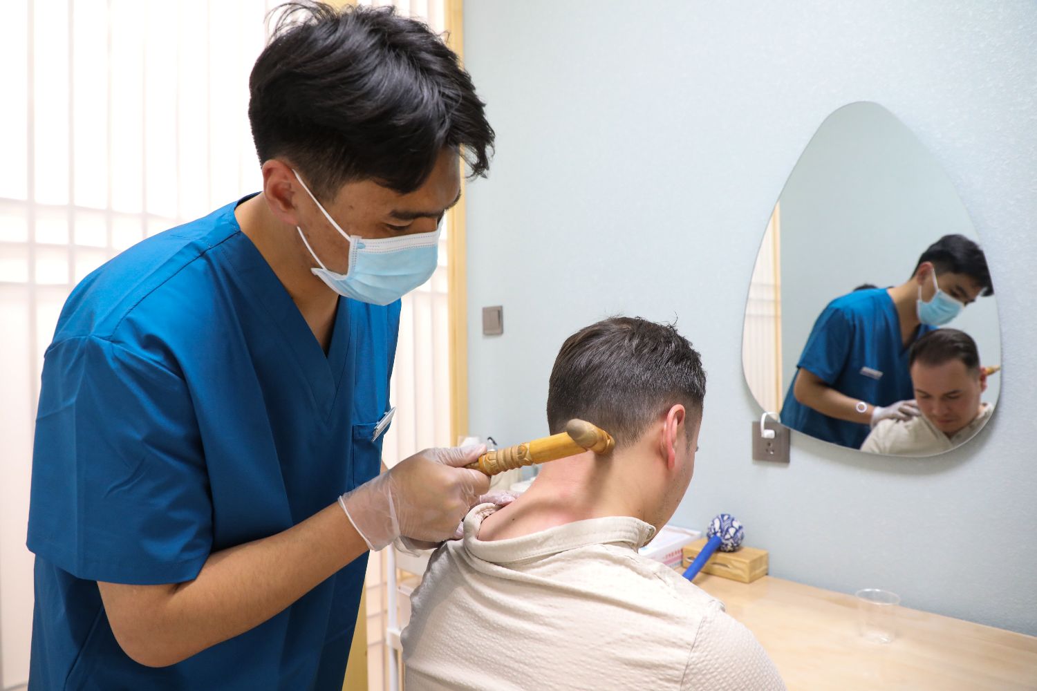 代表团成员体验藏医尤阙疗法。(图片来源:中新社)