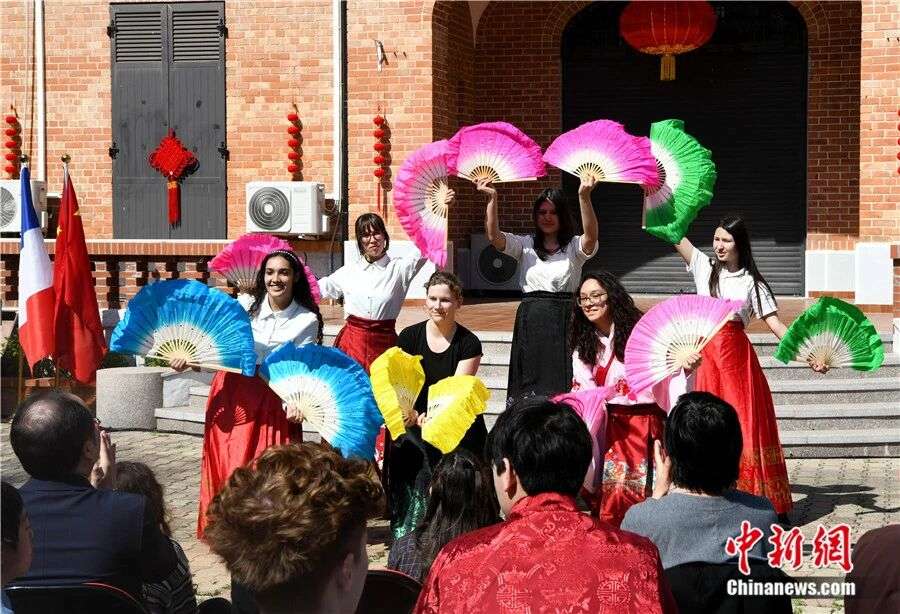 法国普罗旺斯-阿尔卑斯-蓝色海岸大区国际学校学生在表演扇子舞。