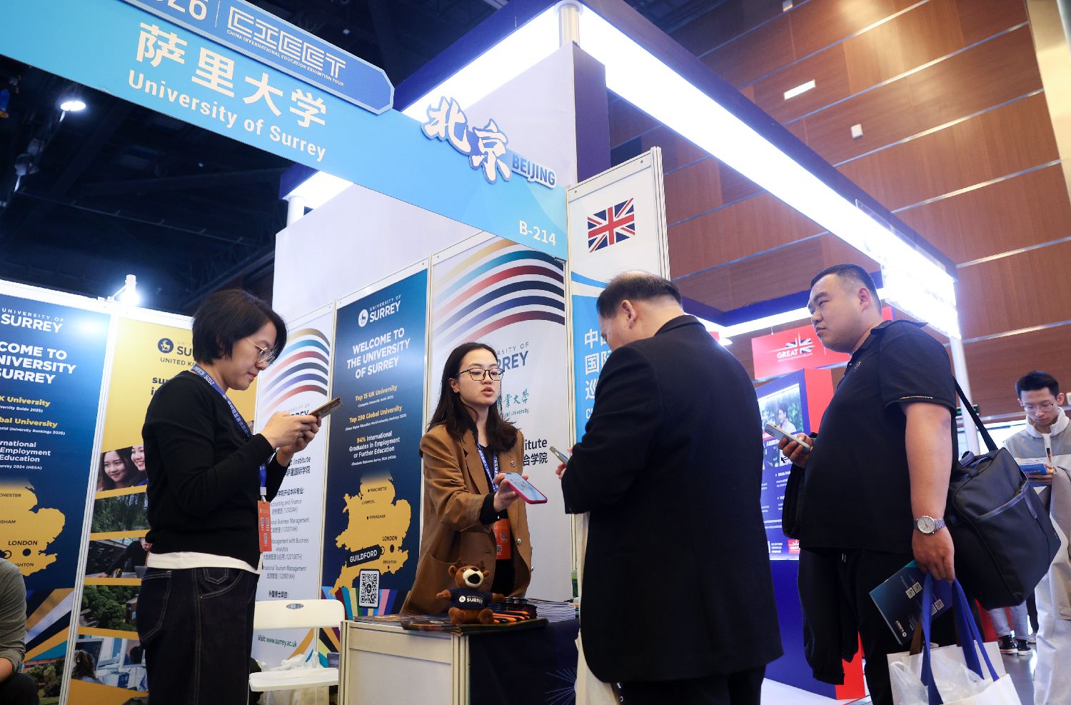 2026年4月10日,英国萨里大学中国区招生官Abby(左2)正在和咨询者交流。 当日,来自26个国家和地区的200余所高校及教育机构展示优质教育资源,为学生和家长带来一手留学资讯。(图片来源:本文图片均自李大鹏 摄)