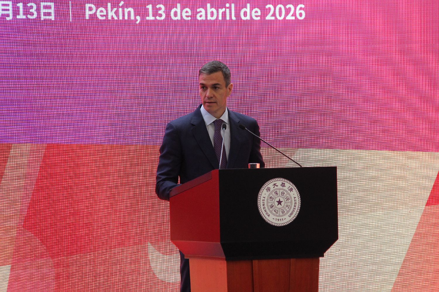 13日,正在对华进行正式访问的西班牙首相桑切斯在清华大学发表演讲。(图片来源:中新社)