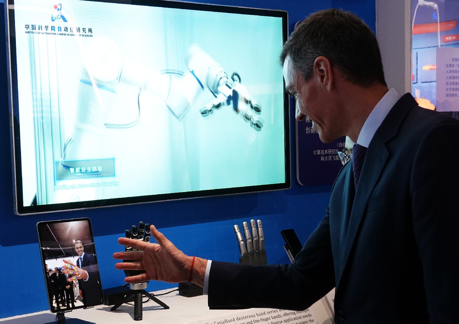 13日,北京,西班牙首相桑切斯参观中国科学院科技成就展,并在过程中进行体验。