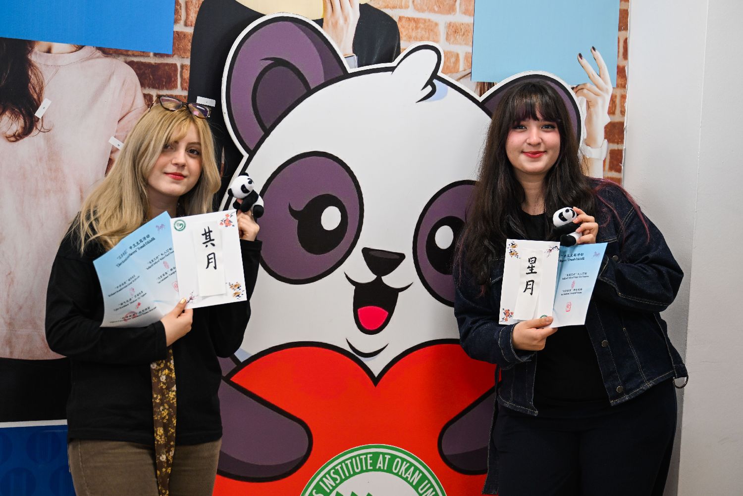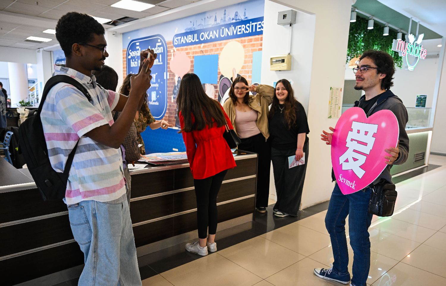 4月20日,在土耳其伊斯坦布尔奥坎大学,学生手持活动纪念品拍照留影。