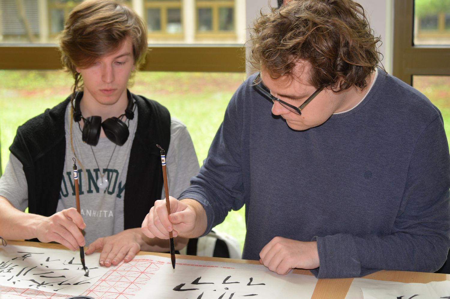 4月21日,克罗地亚学生在萨格勒布大学人文学院举行的“国际中文日”庆祝活动上体验书法。(图片来源:新华社)