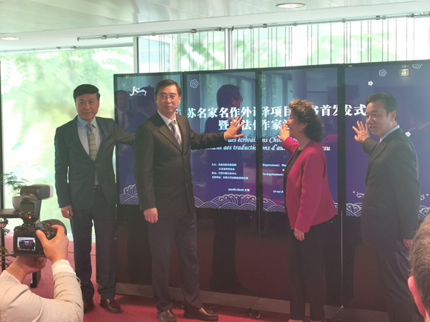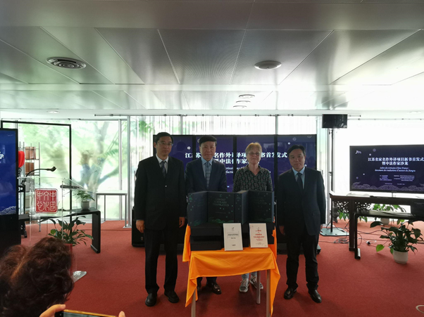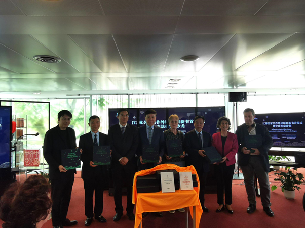 章朝阳、郑焱、刘红革、玛丽安为“从扬子江到塞纳河的思想之旅:江苏学术名家名作外译项目第二期新书”揭幕。