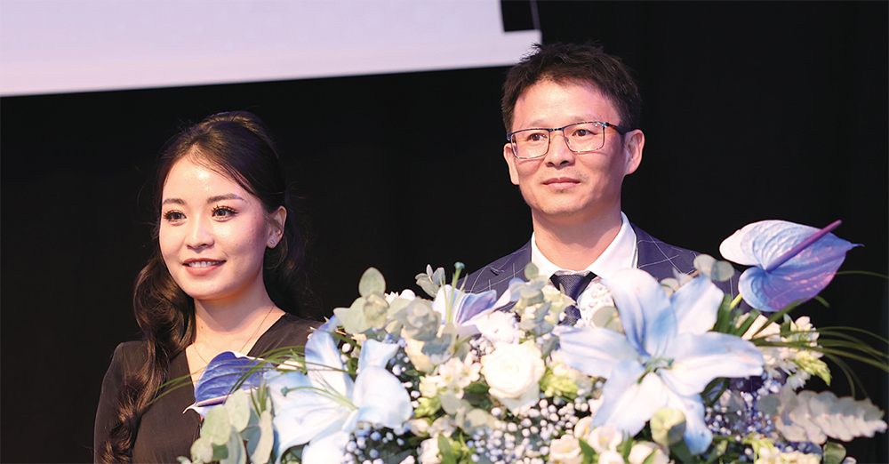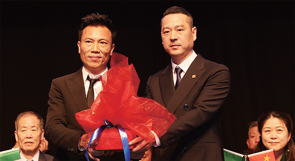 意大利温州工商会第八届第一秘书长兼财务长王伟军(右)与知名主持人周末共同主持庆典活动。