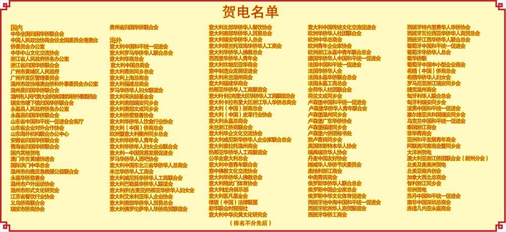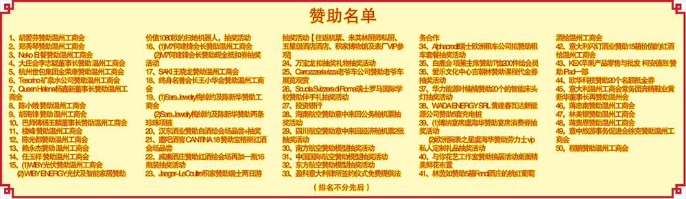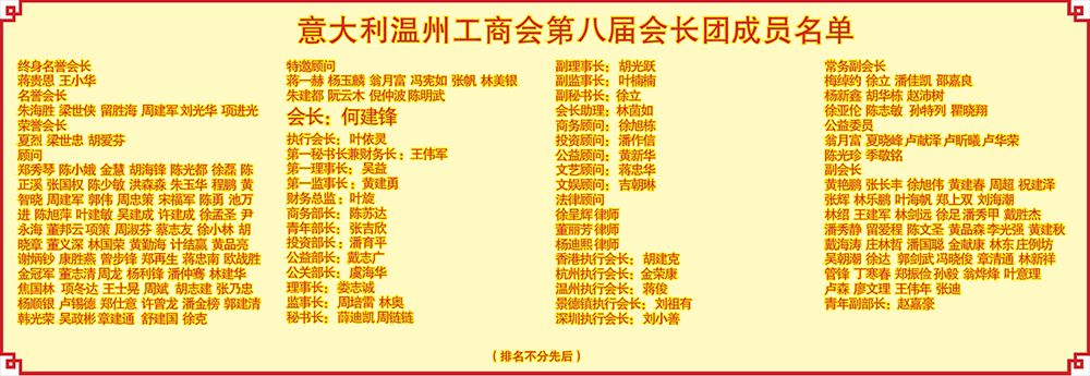讲话环节结束后,意大利温州工商会第一理事长吴益宣读第八届会长团名单。青年部长张吉欣宣读中华全国归国华侨联合会贺信。商务部长陈苏达宣读中国人民政治协商会议全国委员会港澳台侨委员会办公室贺信。
