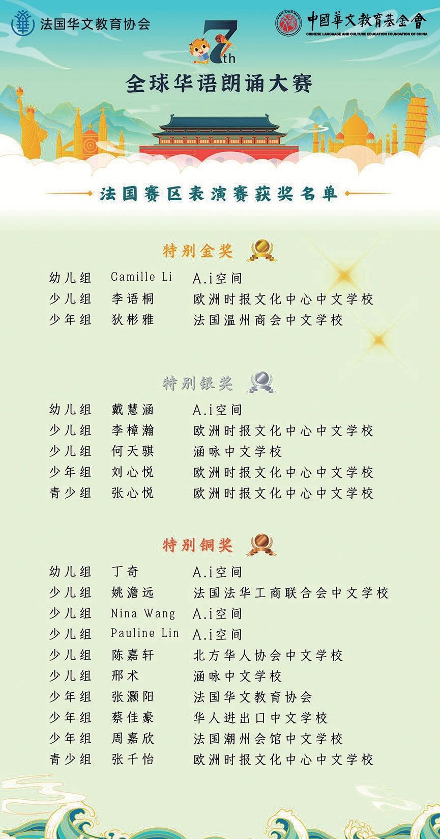 各联合承办机构推荐的选手均展现了不俗的实力,也通过对作品的演绎,表达了对中国、对中文的热爱之情。选手们充满感情地诠释了《我骄傲,我是中国人》、《祖国,我爱你》、《那是我的祖国》、《诗意中国》、《中文之美》等作品,幼儿组的Camille Li可爱呈现了《小老鼠的烦恼》,少儿组李语桐的《梦想》激情澎湃,少年组狄彬雅的原创作品《红》生动再现了在法国的中国春节场景,这三位选手的优异表现征服了评委和现场观众,获得了当天的特别金奖。