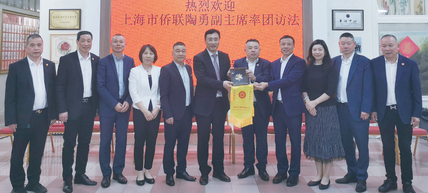上海市侨联代表团向法国华侨华人会总部赠送锦旗、纪念品和感谢信。