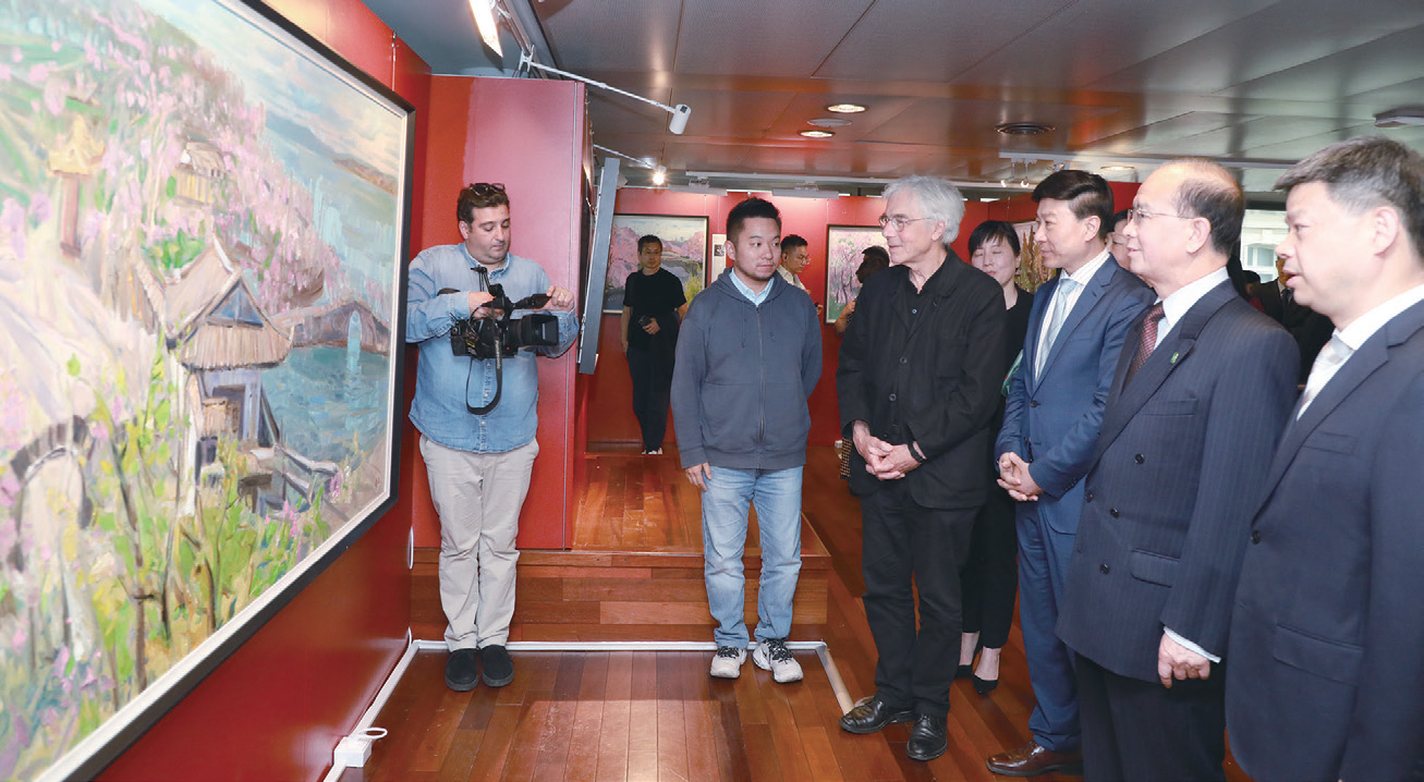 开幕式后,嘉宾们一同欣赏了“无锡城市风采油画展”。该展览精选了中国美术家协会主席范迪安携手多位中国油画名家在无锡实地采风创作的作品。画作内容涵盖无锡的太湖鼋头渚、惠山古镇、梅园、蠡园等著名景点。通过将中国写意山水与世界油画艺术相结合,这些作品将无锡的美景“搬到”了法国观众面前,以油画这一世界语言为媒介,向巴黎讲述无锡的山水人文故事。