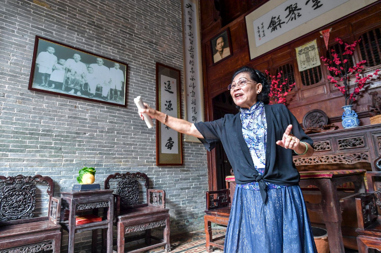 蔡家森曾长房儿媳蔡王普君为访客介绍蔡家宅历史。(图片来源:中新社)
