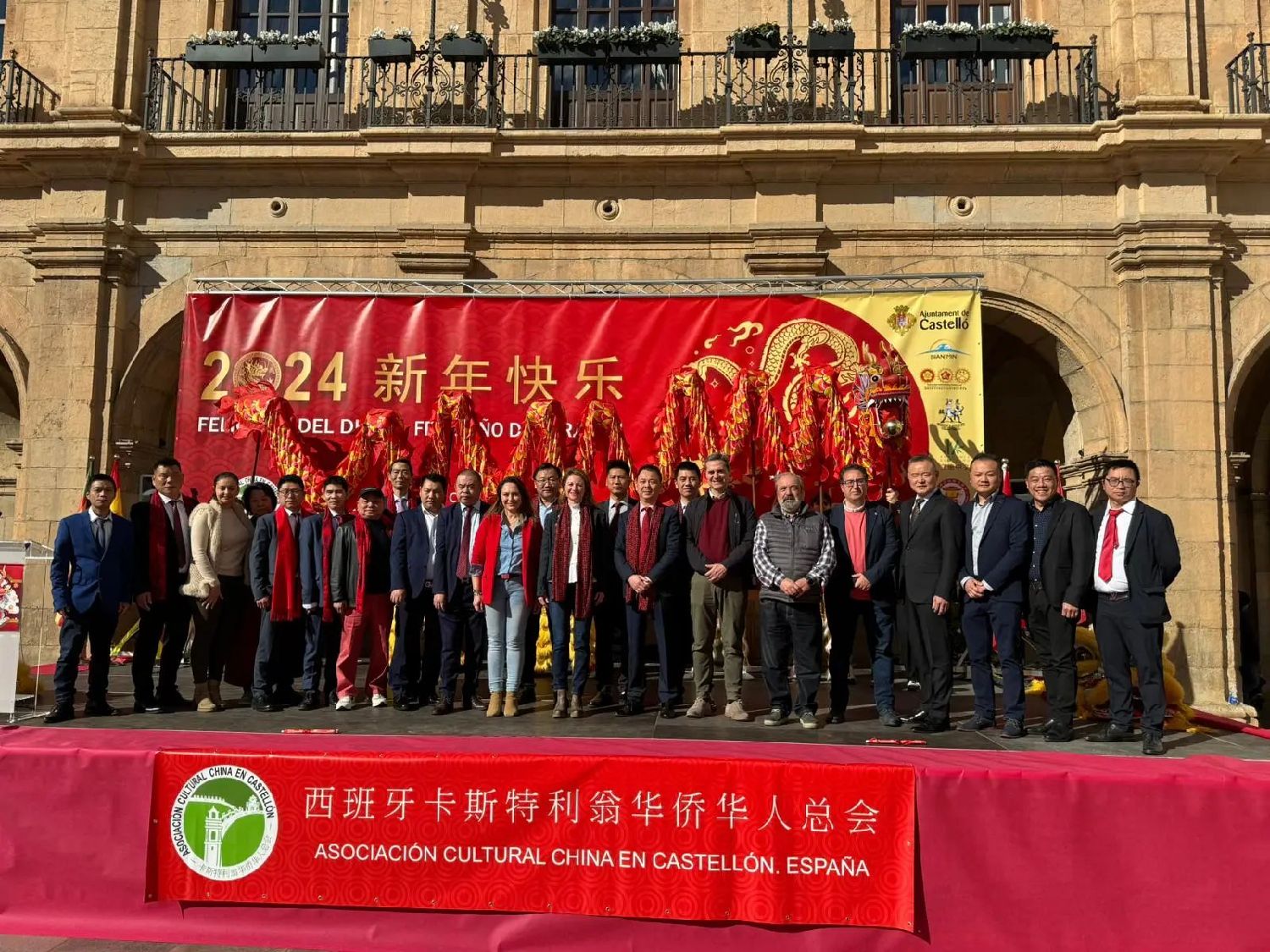 周六上午11点整,随着广场舞龙舞狮开始,汇聚了上万人的广场开始沸腾了起来,首先上台讲话的是卡斯特利翁华侨华人总会会长董伯勇,他代表卡斯特利翁华侨华人总会全体同仁对到场来宾表示热烈的欢迎,对卡斯特利翁市政府的大力支持和帮助表示衷心感谢。他说:“春节是中国民众娱乐狂欢的节日,今天是正月初一,我们举办庙会活动,让大家零距离欣赏精彩纷呈的文化技能,零距离领略中华民族的文化风格,零距离感受中华传统文化的博大精深,同时,把中国春节的喜悦若狂的气氛引到这里,把国内亲友们的诚挚问候和祝福引到这里,把远方的节日吉祥和好运引到这里......希望大家喜欢。笑语声声送兔岁,灯笼盏盏接龙年。在龙年新春之际,祝福大家身体健康,诸事如意,龙年大吉!”