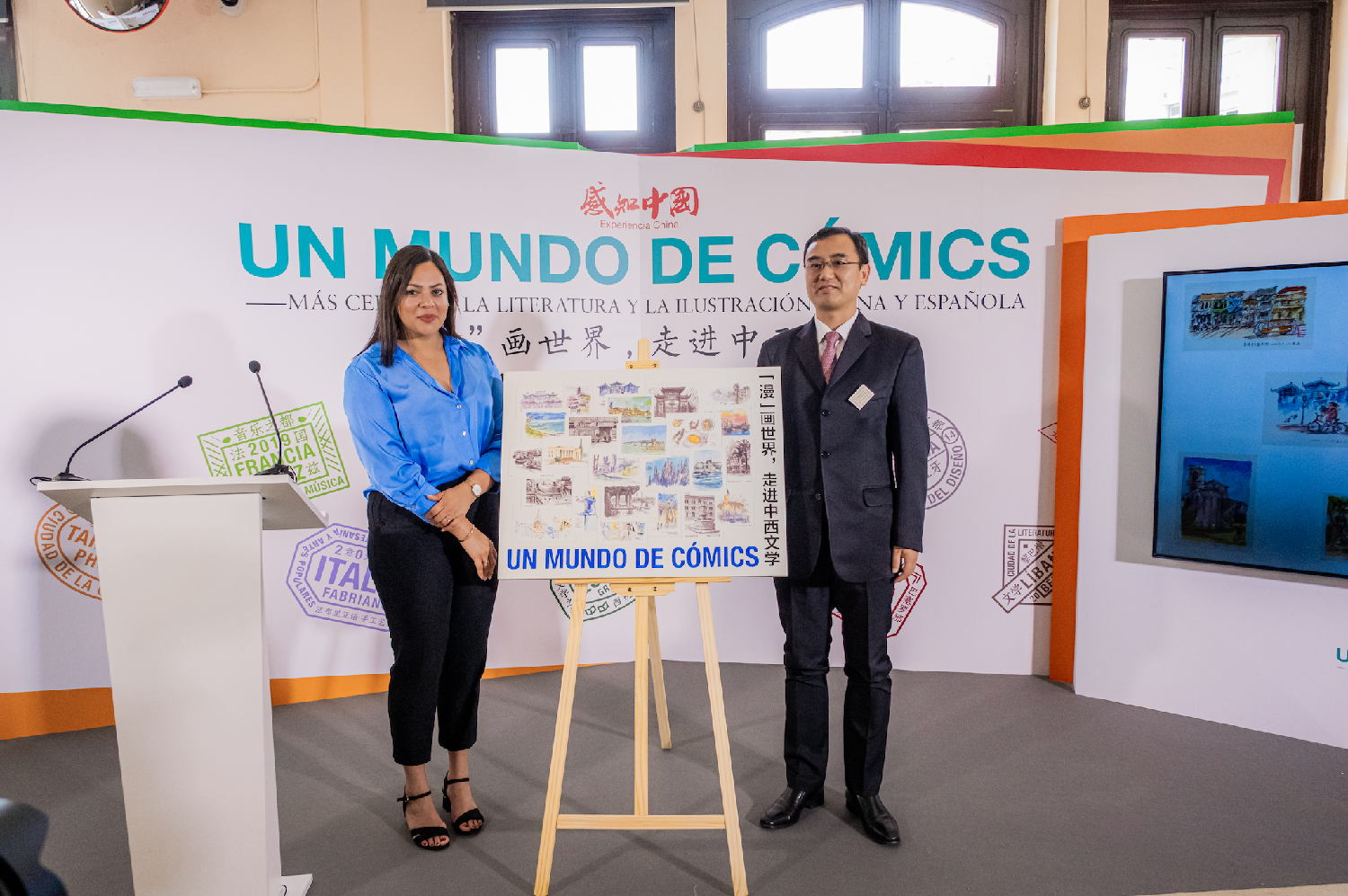 中国驻巴塞罗那代总领事胡爱民和巴塞罗那市政府跨文化专员萨拉·贝尔贝达为国际青年漫画驻地创作成果展揭幕。