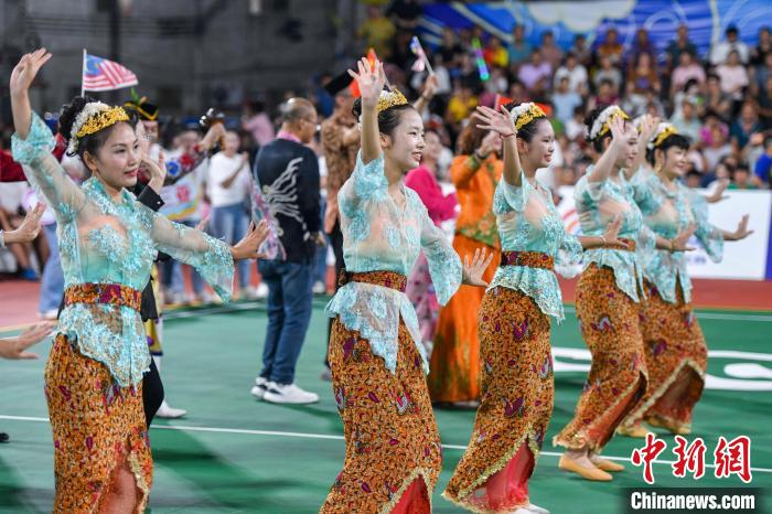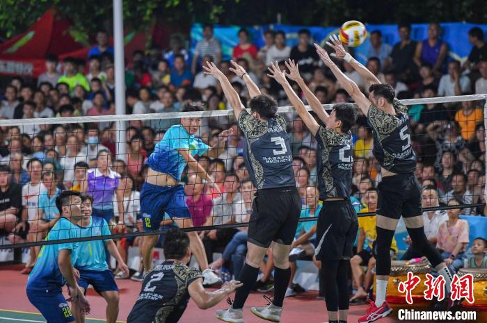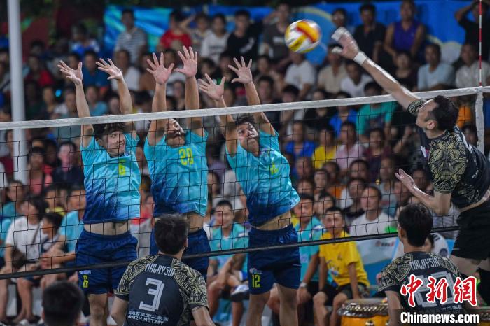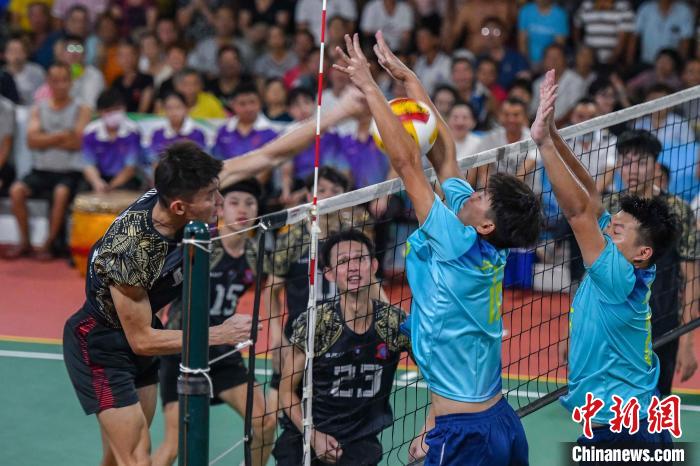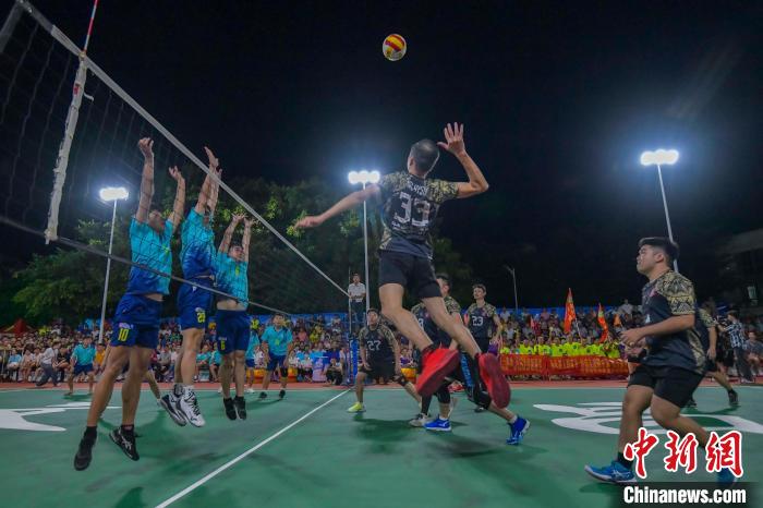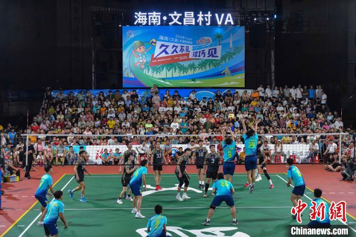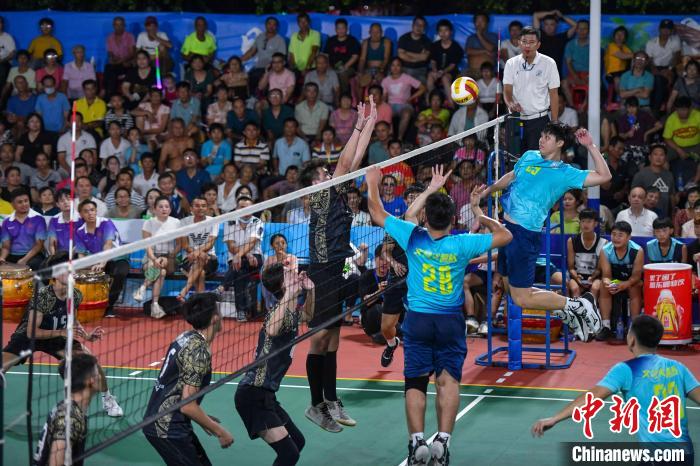 7月13日晚,海南文昌,2024年“九九杯”海南(文昌)乡镇排球联赛铺前站迎来一场中马排球友谊赛,由文昌火箭队(蓝)对阵马来西亚华侨排球队(黑)。经过激烈角逐,最终文昌火箭队3:1战胜马来西亚华侨排球队,为现场观众送上一场“南洋风”排球友谊赛。