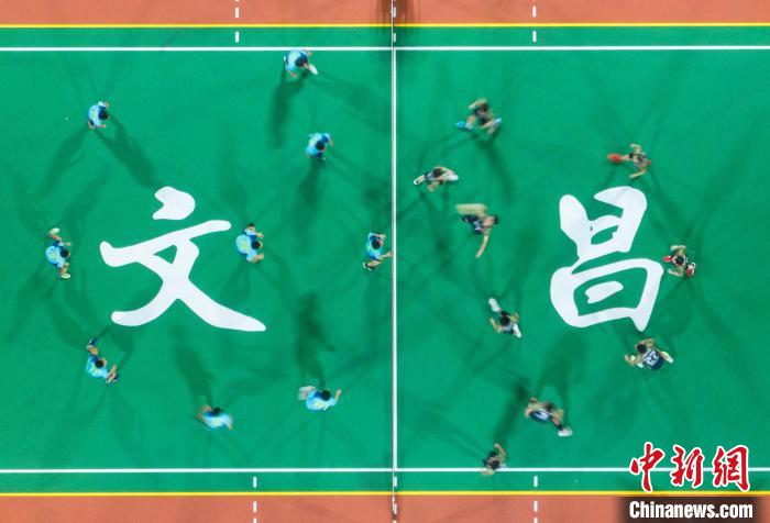 图为文昌火箭队队员(蓝)跃身扣杀。