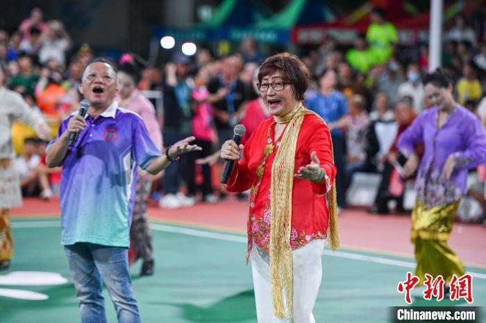 图为马来西亚海南总商会总会长、拿督林秋雅(右)演唱歌曲《乡音代代传》。
