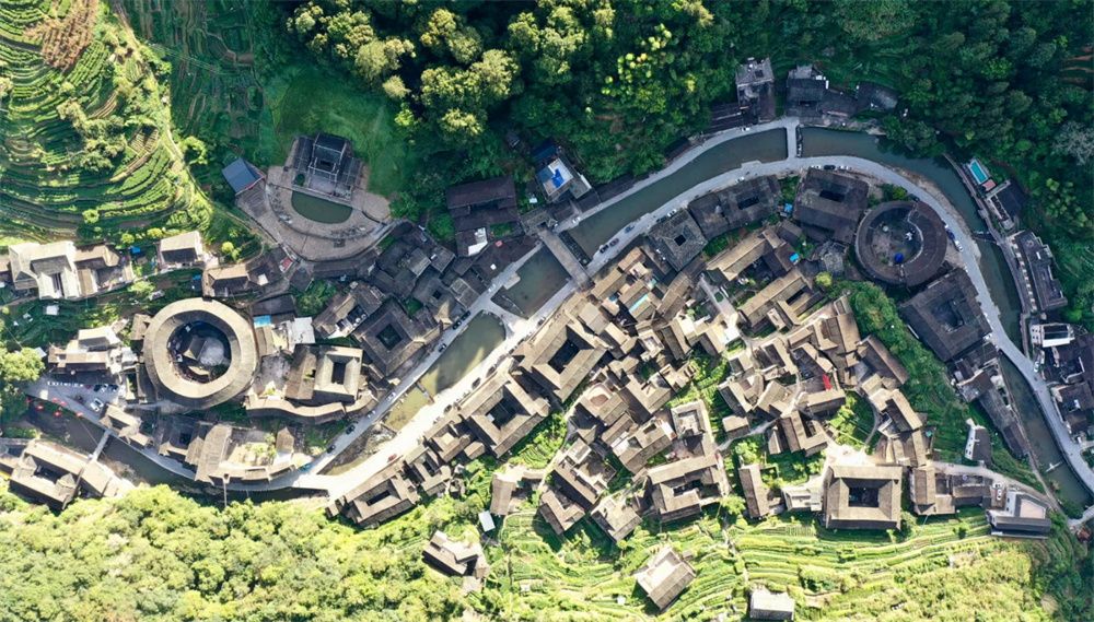 图为有着“太极水乡”美誉的塔下村中,S形河流及其两岸的土楼构成一幅美妙的太极图案。(图片来源:塔下村供中新社)