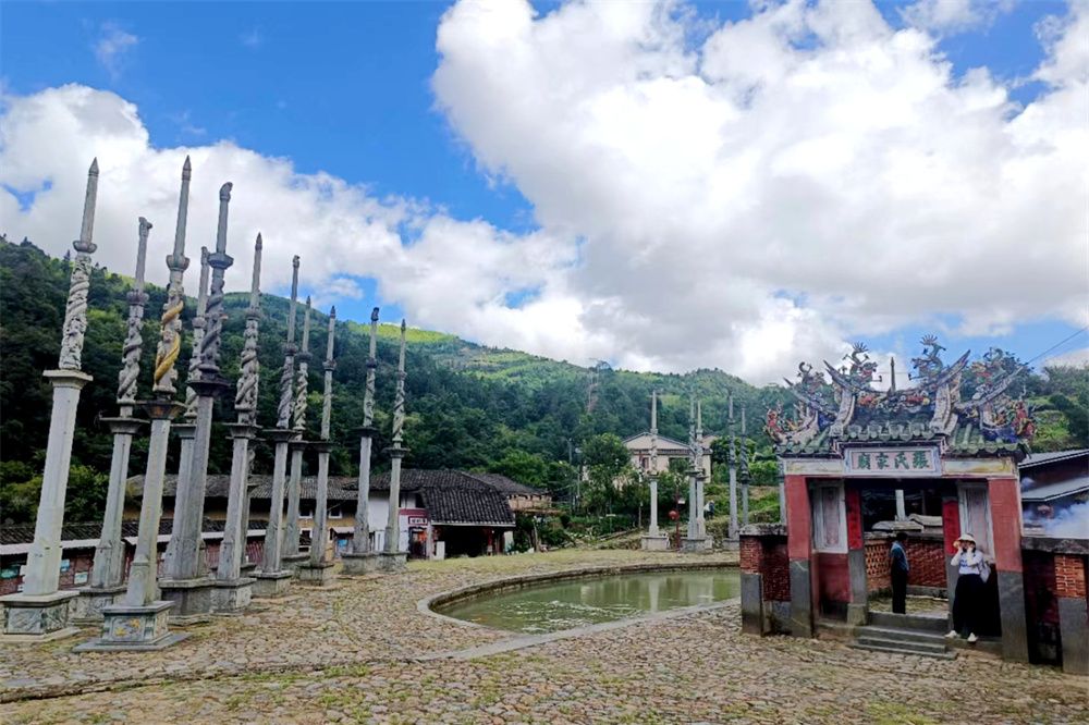 图为塔下村张氏家庙德远堂前,近10米高的24支石龙旗杆笔直竖立。(图片来源:中新社)