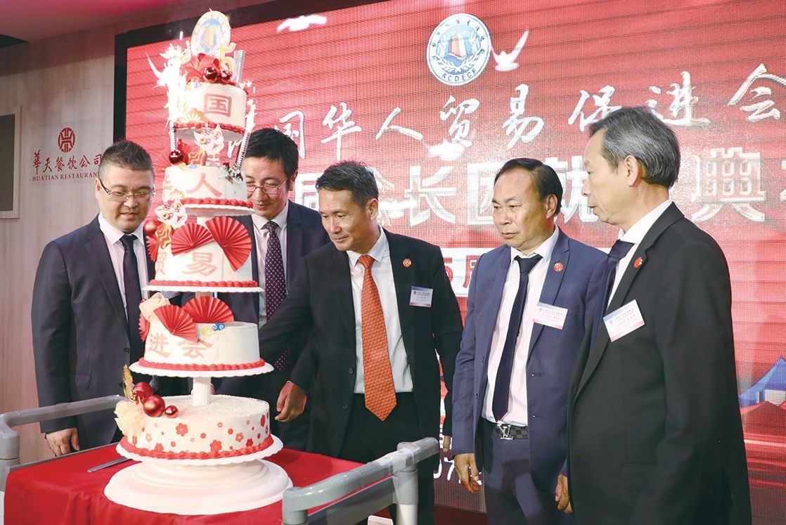 活动现场,万磊、林相伟、周碎金、陈晓靖与法国华人贸易促进会首届会长包志诚,共同切下为庆祝法国华人贸易促进会成立15周年准备的蛋糕。