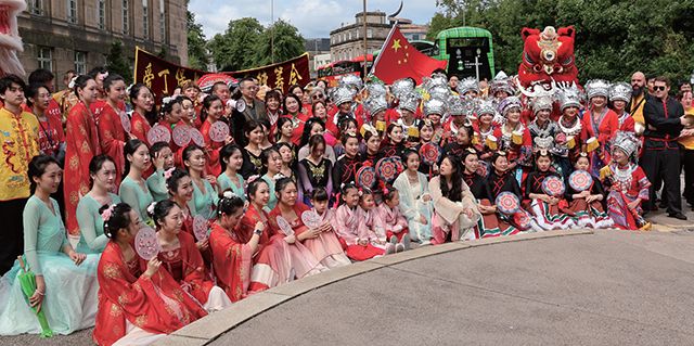 其中,英国广西联谊总会受主办方爱丁堡艺术节统筹会的邀请,加入嘉年华活动的中国方阵表演。数十位英国广西联谊总会成员,身穿美丽的少数民族服饰、戴着精致的头饰,带去了国家级广西非遗“瑶族长鼓舞”,古老又优美的舞蹈深深吸引了中外观众,引起大家连连赞叹。街道两旁摄影师扛着“长枪短炮”拍个不停,观众们也紛纷要求和队员合影留念。