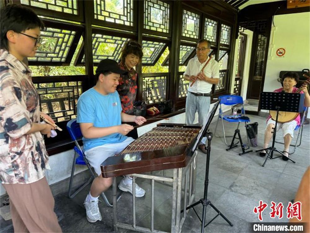 法国华裔青少年在上海古猗园的凉亭内尝试弹奏乐器。(图片来源:中新网)