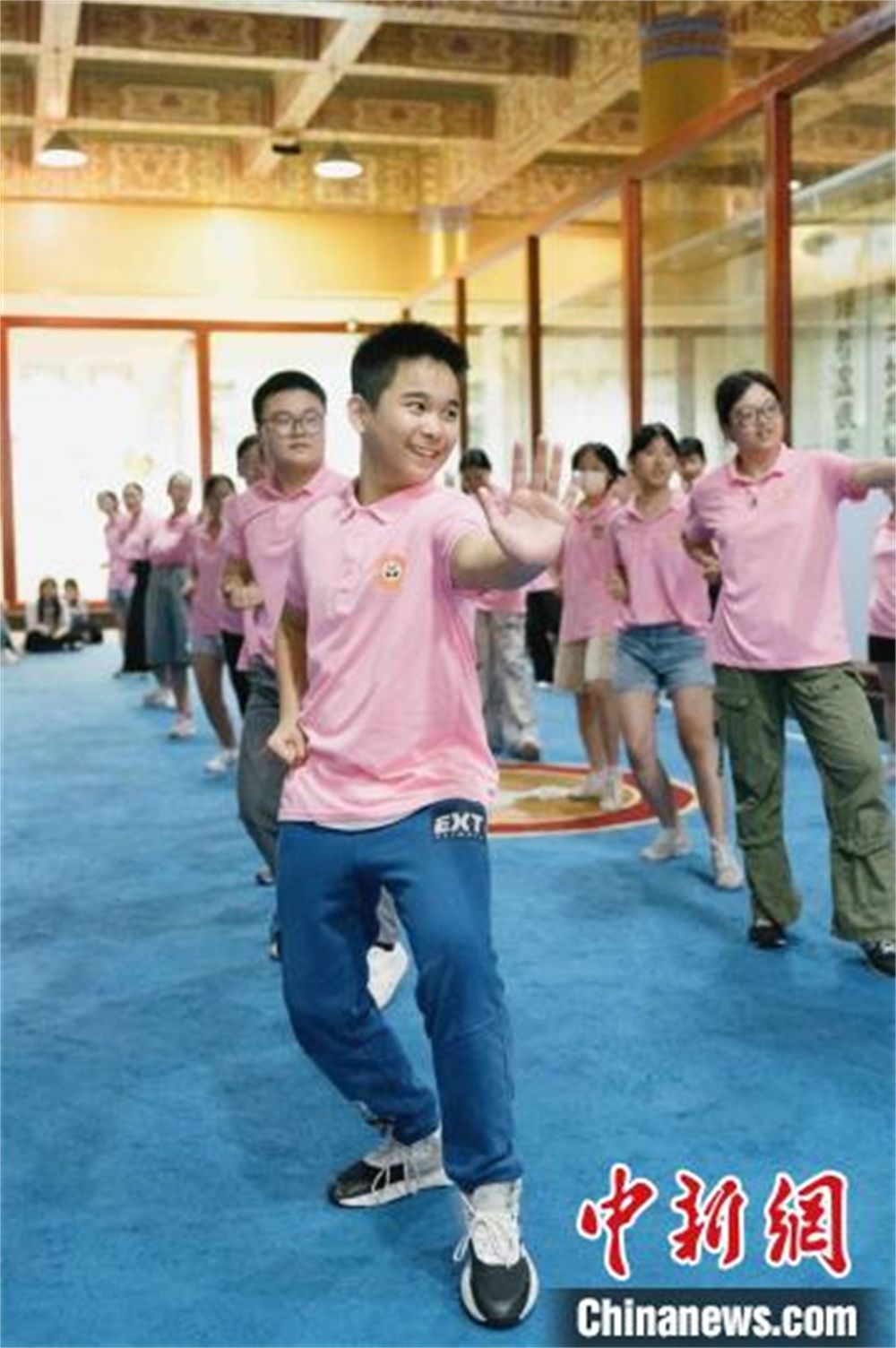 在武术老师的带领下,华裔青少年们认真学习一招一式,从最初的生涩到逐渐熟练,大家沉浸在练习武术的快乐中。来自意大利的曾毅航今年14岁,虽然额头上布满汗珠,但他仍然兴趣十足,认真跟练。