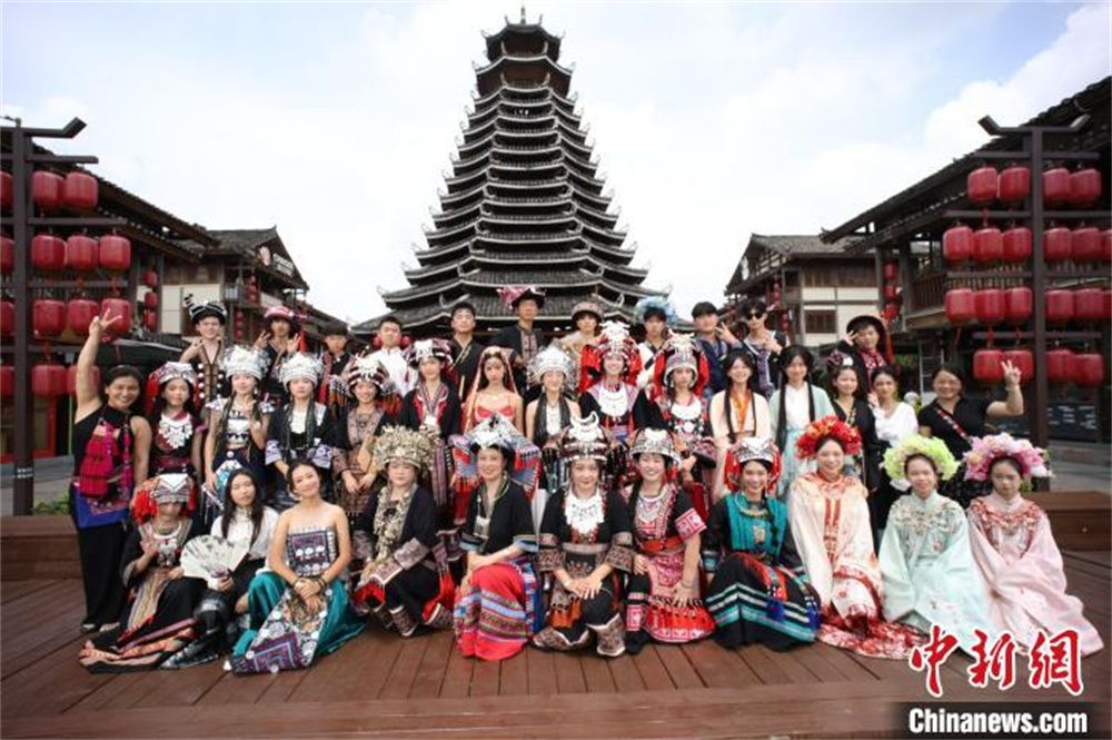 8月13日,图为海外华裔青少年在南宁相思小镇体验民族服饰。(图片来源:广西国际商务职业技术学院国际交流学院供中新网)