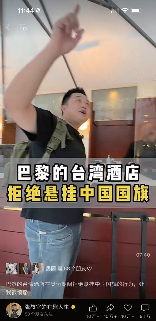 现在大家都知道了,黄小杰会长陪同的朋友就是国际正能量人道主义救援队队长,在抖音拥有712.7万粉丝的“张教官”。他随即在抖音发布一段“巴黎的台湾酒店拒绝悬挂中国国旗”的短视频。